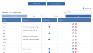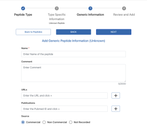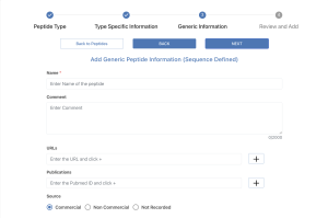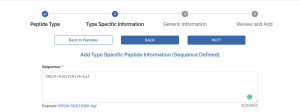 There are two types of peptides that can be added to the system. "Sequence defined" peptides are amino acid sequences with known sequences. "Unknown" peptides are peptides where the exact amino acid is unknown or will not be provided due to IP reasons.